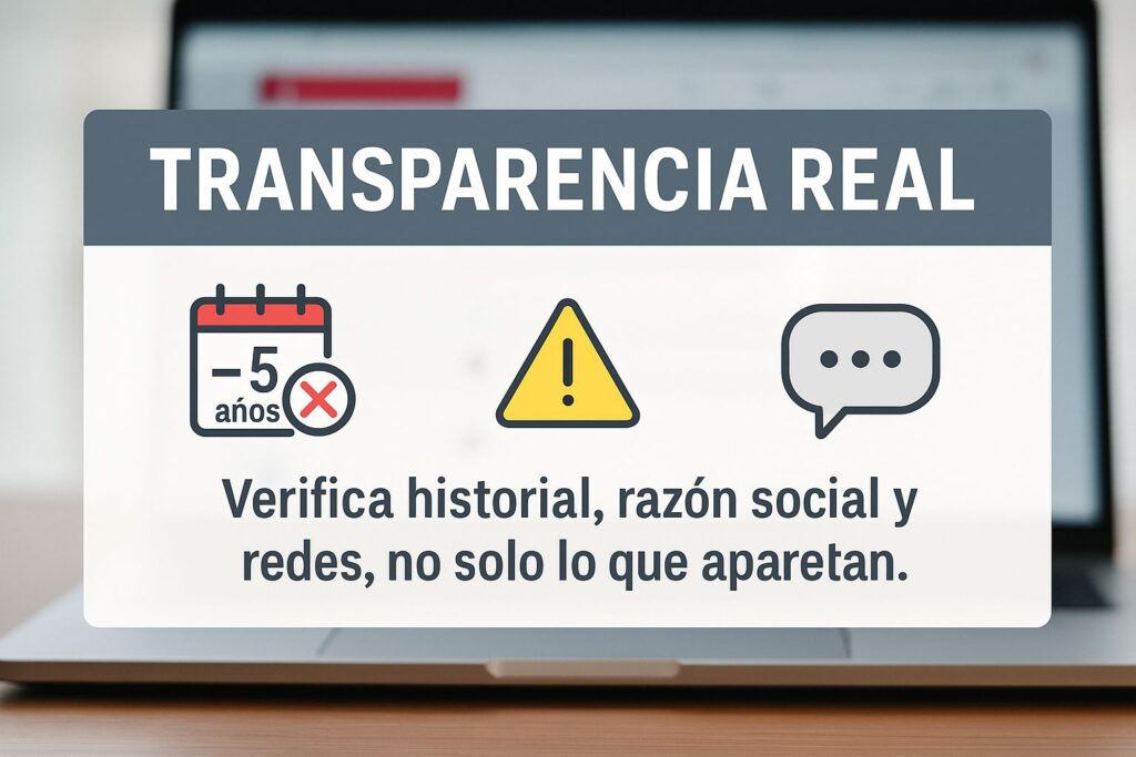 Que una razón social sea antigua no significa que la empresa tenga experiencia real en el sector. Hay compañías que cambian constantemente su razón social, pero mantienen el mismo nombre comercial para ocultar su historial. Incluso sus redes sociales pueden ser nuevas, aunque se presenten como líderes con “años de experiencia”.
